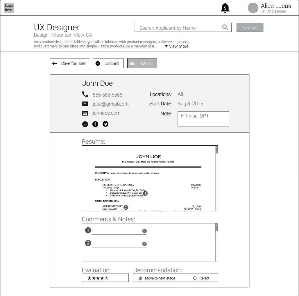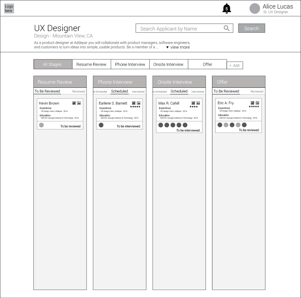 To invite a new talent into the organization is always not an easy task. Other than the evaluation process, the candidate pool is usually huge, people are all busy so the scheduling is always tough. These all add up to the challenges of the hiring process to the company. This web app design is an exercise for a company to think about a tool that allows employees to track interview candidates and handle the recruitment needs to make the hiring process easier and smoother.